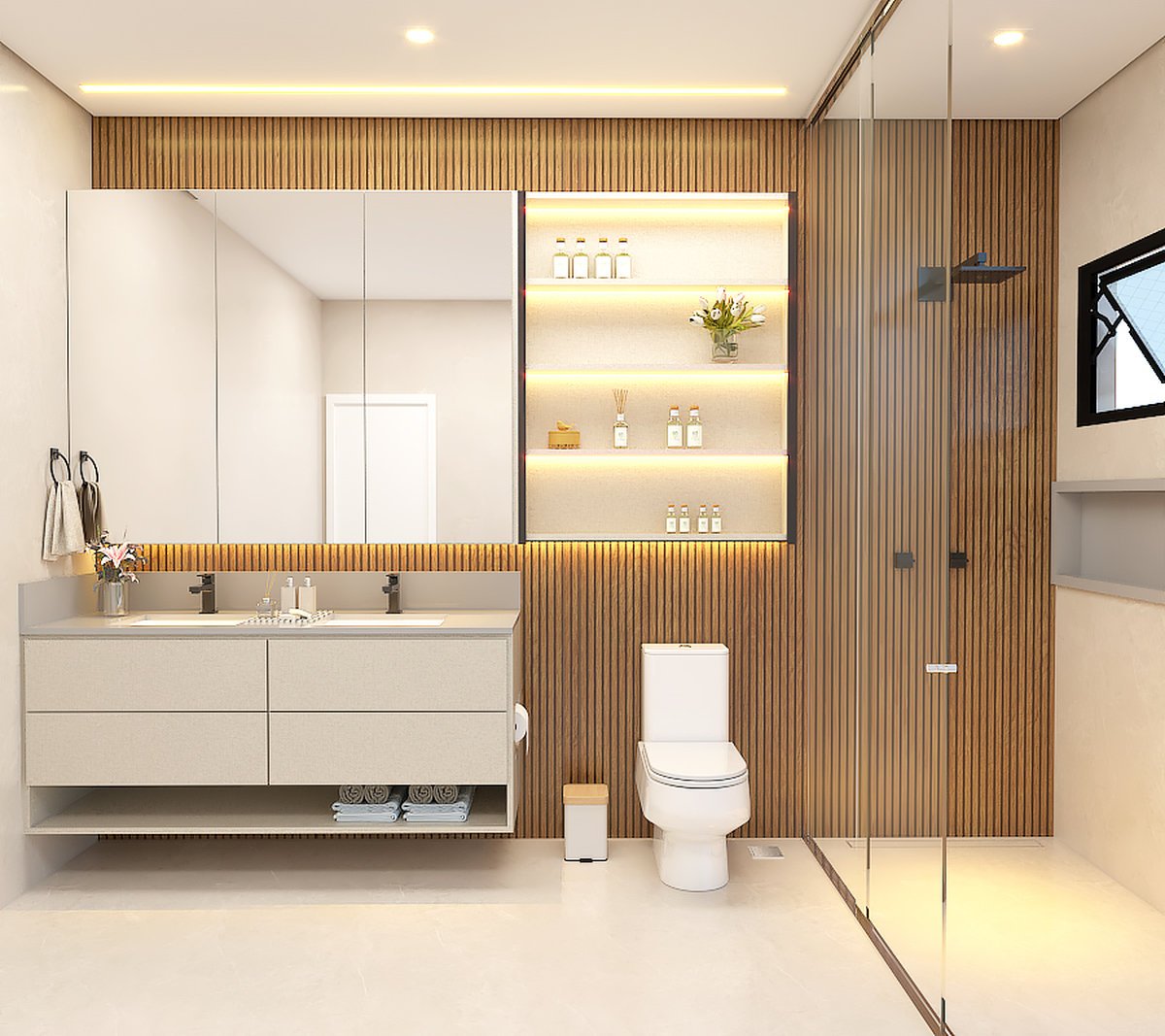 Materiais como madeira clara, vidro e tons neutros ampliam a sensação de amplitude e aconchego.