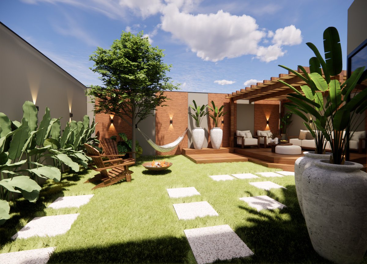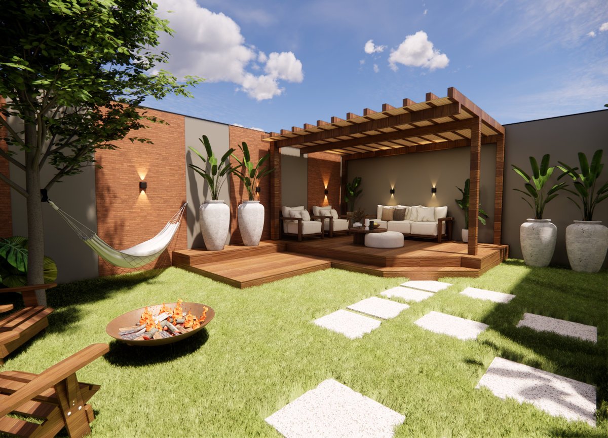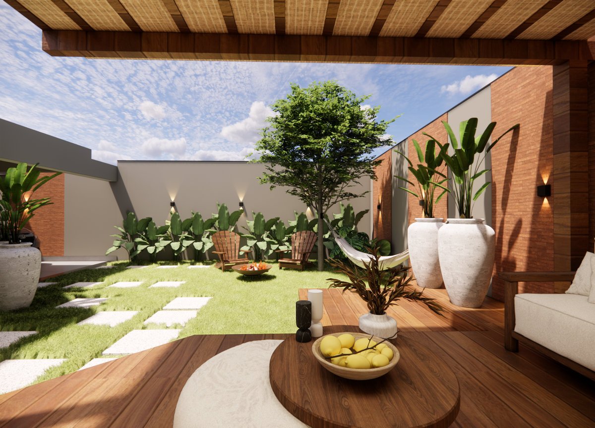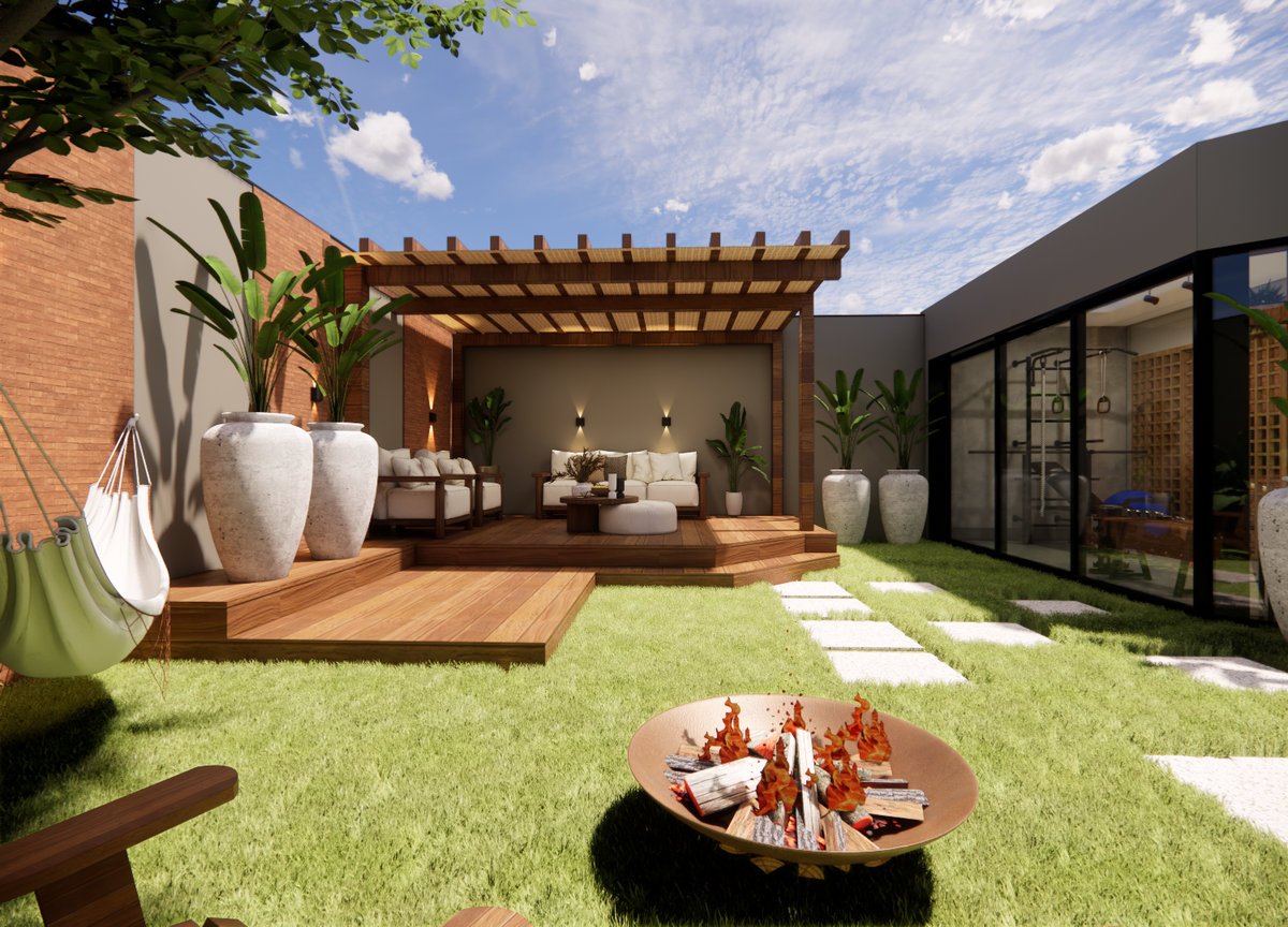 Este projeto de área externa valoriza o lazer e o conforto com uma atmosfera acolhedora e contemporânea. A composição inclui um elegante pergolado de madeira com mobiliário estofado, ideal para convivência ao ar livre. O paisagismo é marcado por vasos grandes com plantas tropicais e gramado com caminho em pedras brancas. A lareira de chão e a rede presa à sombra da árvore reforçam a proposta de relaxamento. Materiais naturais como madeira e tijolo aparente criam harmonia com a natureza, resultando em um espaço sofisticado e funcional.